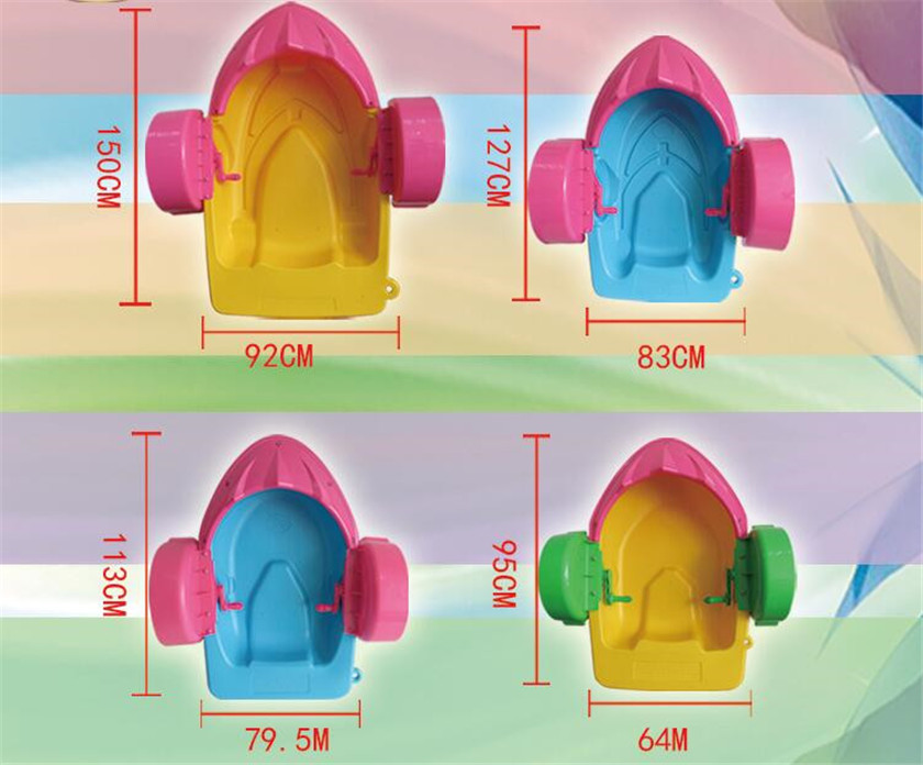 Blow plastic boat body and 0.65mm soft PVC Inflatable tube.Our Paddle Boat is consist of 5 separated part: boat body, handle, wheel, front cover, splash guard.
